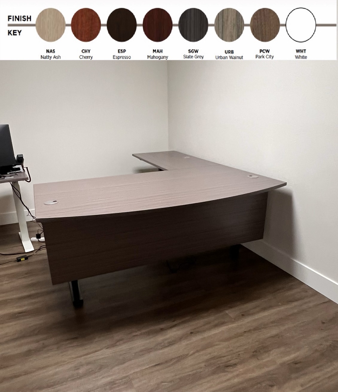 OFS L Shape HAT Desk 7 finishes with modesty, white, silver or black storage
